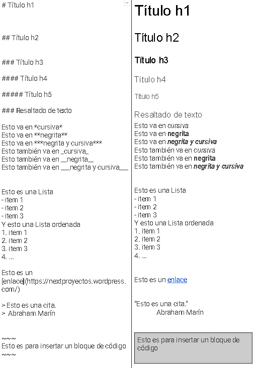 A continuación puedes ver un ejemplo de la sintaxis básica de markdown, a la izquierda y el resultado obtenido a la derecha. Como puedes comprobar la sintaxis es muy sencilla y el texto es de fácil lectura.