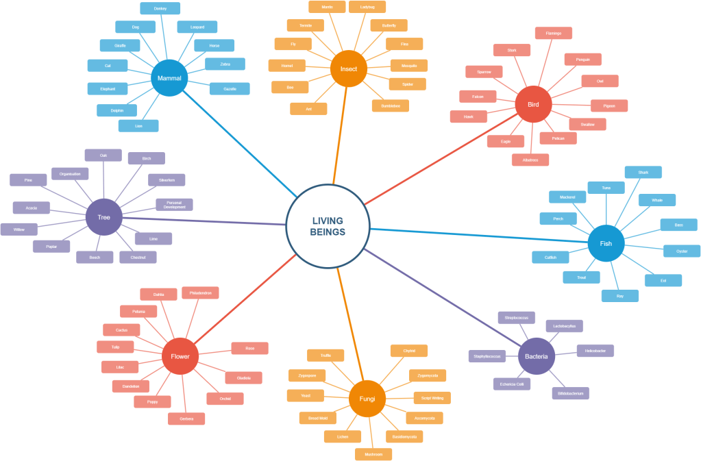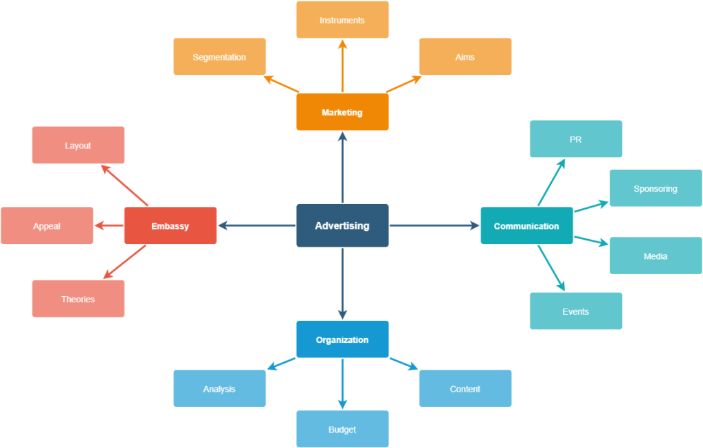 Se parte de un concepto o tema principal que se sitúa en el centro y que se expande de forma radial, enlazando con las principales ideas o conceptos relacionados, a su vez estos conceptos principales se expanden enlazando con las ideas o conceptos secundarios y así sucesivamente hasta que sea necesario.