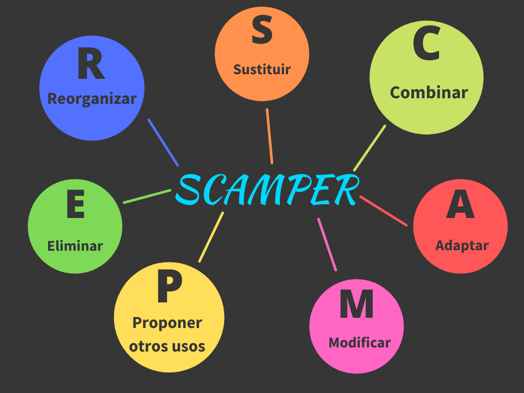 SCAMPER es una técnica de ayuda a la creatividad, basada en el cuestionamiento y orientada a revisar el problema desde diferentes puntos de vista, enfocada a la generación de ideas, no ya para la definición del problema, si no para su solución, haciendo uso de una regla nemotécnica, para realizar diferentes preguntas respecto al problema que pretendemos resolver.